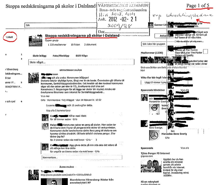 Vad var det då för handling som kommunalrådet Lidell diarieförde? Ja, inte var det en handling som hade inkommit till Vänersborgs kommun! Nej, det var en handling som kommunalrådet hade hämtat från Facebook.