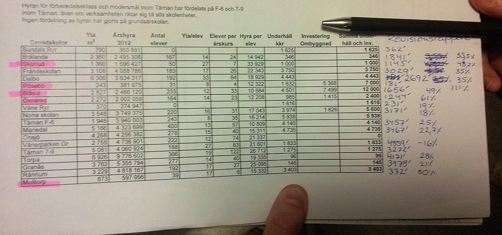 Det Ulrika gjorde var att kolla skillnaderna i hyror mellan de olika källorna. Hon såg ett mönster. Och det var en nyhet! De skolenheter som hade störst skillnad i hyror i Barn- och Ungdomsförvaltningens siffror jämfört med revisionens var just de skolor som förvaltningen vill lägga ner! Med andra ord. Hyrorna för Rösebo, Skerrud, Mulltorp och Blåsut var mer eller mindre kraftigt ”övervärderade” i Barn- och Ungdomsförvaltningens siffror! Jämfört med andra skolor… Som inte var hotade av nedläggning…