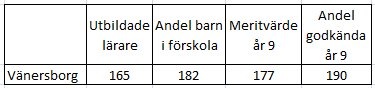 Förskolan är en fråga för sig. Annars ser vi att de gamla, friska lärarna också är utbildade. Rankingen för meritvärdena och andelen godkända elever i åk 9 är ”rätt ok”. (Mättillfället för uppgifter avseende elever avser läget den 15 okt 2011.) Här gjorde Vänersborg en ordentlig uppryckning jämfört med året innan. Det var emellertid bara en enda skola, Tärnan, som stod för hela ökningen. Tärnan hade bäst resultat av samtliga högstadieskolor i kommunen. Jag tror att förvaltningen borde ha analyserat orsaken till de kraftigt förbättrade betygen, innan Tärnan fick pris av ordförande i BUN Eckerbom Wendel… Det fanns nog en del att fundera på kring detta.