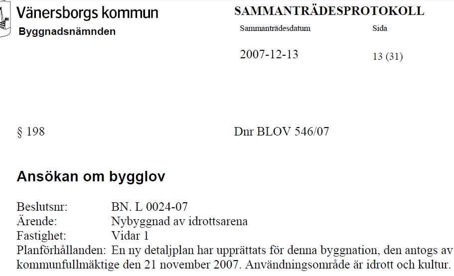 Har Byggnadsnämnden gjort det? Beslutet går tydligen att delegera. Två tjänstemän tog beslutet den 16 juni 2010 att arenan fick användas,