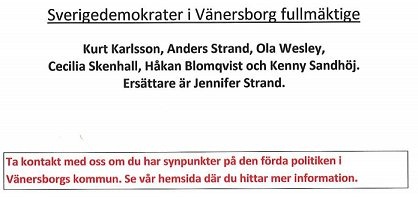 Jag har fortfarande inte blivit riktigt klok på vad det är som jag håller i min hand. Jag börjar luta åt att det är en broschyr som SD tänker dela ut på Aqua Blå. En broschyr som vänder sig till vänersborgarna, som om det vore val snart. Broschyren vänder sig definitivt inte till fullmäktiges ledamöter. Det illustreras t ex av den sista sidan, där partiets ledamöter i fullmäktige räknas upp. Det vet ju vi i KF redan. Sedan uppmanar