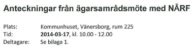 Jag har i min hand mötesanteckningar från ett ägarsamrådsmöte den 17 mars 2014. (De finns också diarieförda i kommunens diarium av Gunnar Lidell.) Det är de officiella och justerade anteckningarna från ett möte mellan NÄRF:s politiska ledning och ledningen för de kommuner som ingår i NÄRF, dvs Vänersborg, Trollhättan, Mellerud och Färgelanda.
