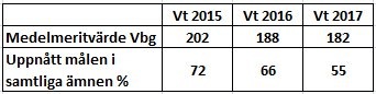 Av tabellen ovan framgår hur stor andel av alla elever i åk 9 i Vänersborg som har klarat kunskapskraven, och inte, i svenska, engelska och matematik under de tre senaste åren (den vänstra kolumnen). Vi ser att andelen har sjunkit i alla tre ämnen, men häpnadsväckande mycket i matematik det senaste året.