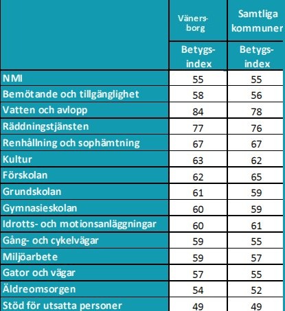 Det är bara ”förskolan” och ”idrotts- och motionsanläggningar” som har sämre värden än genomsnittet för de medverkande kommunerna. Och det kan jag förstå. Men nästa år tas de gamla BUP-lokalerna på Vänerparken i bruk och en ny förskola ska byggas i kvarteret Hönan. Antagligen kommer siffran för ”förskolan” då att höjas.