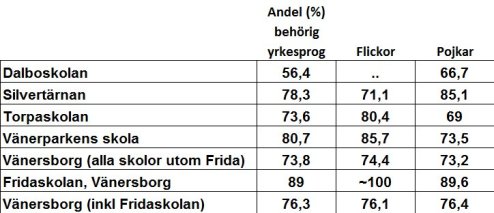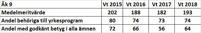 Skolverket tittar också på hur stor andel av eleverna som är behöriga till ett yrkesprogram. Det innebär eleverna ska ha godkända betyg i svenska, engelska och matematik samt i minst fem ämnen till.