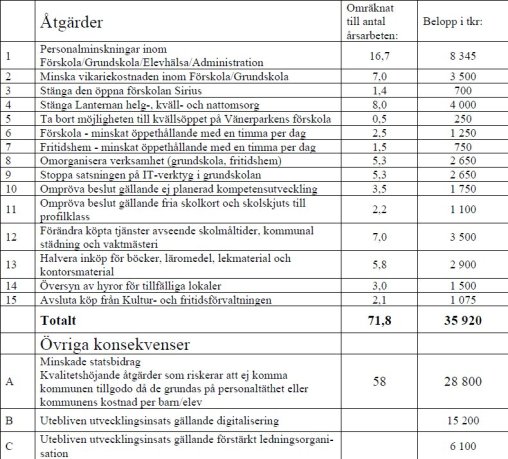 Barn- och utbildningsförvaltningen har tagit fram ett åtgärdsprogram med konsekvensbeskrivningar. Det betyder på ren svenska att förvaltningen har tagit fram besparingsåtgärder för att kunna hålla sig inom de ekonomiska ramar som kommunstyrelsen har bestämt.