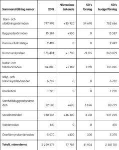 Den andra kolumnen, ”2019”, anger Marie Dahlins förslag innan kommunstyrelsen i onsdags. Sedan har nämndernas äskande inför nästa år angetts, dvs hur mycket pengar nämnderna anser sig behöva för att täcka sina kostnader och upprätthålla en acceptabel och lagenlig verksamhet. De här äskandena står en majoritet av politikerna i respektive nämnd bakom, inte sällan eniga nämnder. Därefter kommer en kolumn med de pengar som SD föreslår att nämnderna ska få. Den sista kolumnen är Marie Dahlins förslag ”plussat” med SD:s föreslagna budgettilldelning. De två sista kolumnerna utgör således sverigedemokraternas budgetförslag.