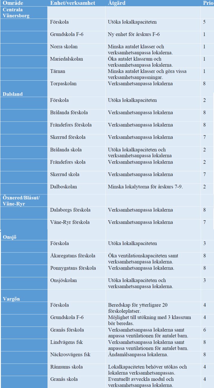 ”Åtgärderna presenteras per område och prioriteras. Utökning av lokalkapaciteten är högst prioriterat, alla barn och elever måste få plats, därefter får verksamhetsanpassningar göras. Då många åtgärder för att utöka eller minska elevantalet är beroende av varandra får de samma prioritet. De som bedöms vara sämst verksamhetsanpassade åtgärdas först och i de fall flera enheter uppfattas vara i samma behov av åtgärder får de samma prioritet. På vissa enheter behöver ventilationen dimensioneras efter antalet barn/elever som vistas där idag. Detta är inte med i prioriteringsordningen utan behöver åtgärdas omedelbart.”