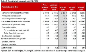 I årets (2019) mål- och resursplan är kommunens resultat budgeterat till ungefär +37 miljoner. Det är mycket tveksamt om detta uppnås. Socialnämnden har redan flaggat för att den inte kan skära ner verksamheterna så att nämnden kan hålla sig inom budget. Det är även mycket tveksamt om socialnämnden klarar sig med de pengar den får för 2020… (Läs mer om detta i dagens blogg från Lutz Rininsland, V: ”När kommer nämndens begäran?”)