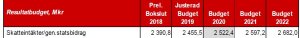 Skatteunderlaget ökade 2018 med 3,6% och i år (2019) beräknas det öka med ”bara” 3,0%. En långsammare ökningstakt således, vilket fortsätter nästa år (2020) då ökningstakten också prognostiseras till 3,0%. Det ser faktiskt ljusare ut 2021 och 2022, ökningen av skatteunderlaget beräknas öka med 3,9% respektive 4,0%. I absoluta kronor ser det ut så här, men notera att här räknas de generella statsbidragen in i skatteintäkterna: