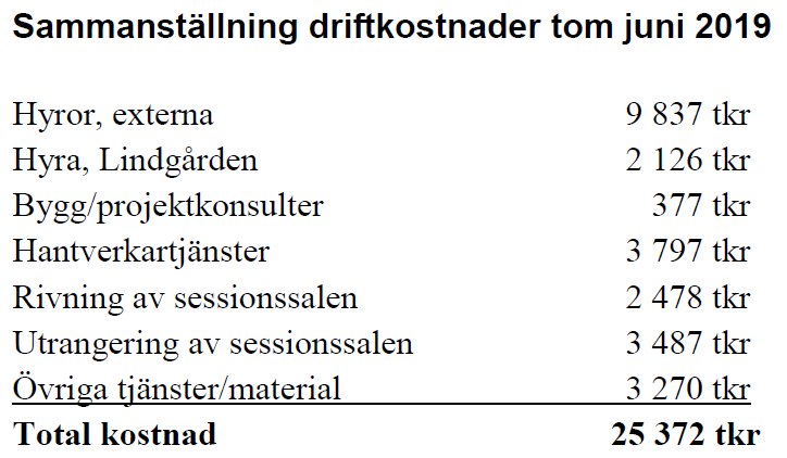 De totala driftskostnaderna uppgår alltså till drygt 25 miljoner kronor. Och det fram till och med juni. Lokalerna hyrs fortfarande och kommer så att göras fram till kommunhuset står färdigt för inflyttning. Prognosen för hyreskostnaderna resten av 2019 uppskattas till 3,25 milj kr.