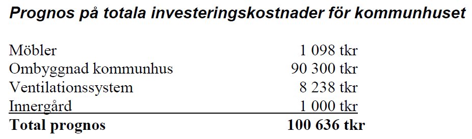 Investeringskostnaderna är uppe i nästan 77 miljoner… Men det räcker inte. Kommunhuset är ju inte klart. Prognosen för de totala investeringskostnaderna är: