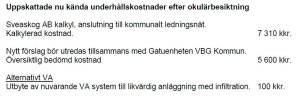 Det finns i de sammanfattade uppskattade kostnaderna tre olika alternativ, som jag uppfattar det (se bild), av VA-kostnaderna. De tidigare nämnda, dvs i den andra handlingen, på 7,31 milj kr. Men också ett alternativ: