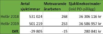 Det totala antalet sjuktimmar minskade 2019 jämfört med 2018, med 29.805 timmar. Det motsvarade 15 årsarbeten. Trots de förbättrade sjuktalen så motsvarade de totala 501.219 sjuktimmarna förra året hela 253 årsarbeten. Detta innebar en kostnad för kommunen på nästan 36,6 miljoner kronor. Det var för övrigt ungefär 281.000 kr mer än året innan.