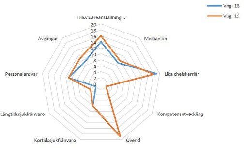 “Vänersborgs kommun har högre poäng än branschen inom nyckeltalen: Andel tillsvidareanställda, Övertid, Kortidssjukfrånvaro och Avgångar. Men däremot lägre poäng inom nyckeltalen: Medianlön, Anställda per chef och Långtidssjukfrånvaro.”