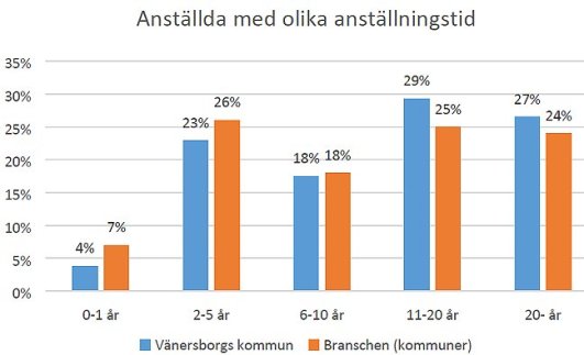 Resultatet visar att Vänersborgs kommun har en större andel tillsvidareanställda medarbetare med lång anställningstid i jämförelse med andra kommuner. Det kan väl tänkas bero på att de anställda trivs med kommunen som arbetsgivare. Och det är naturligtvis positivt. Men ska man se negativt på det, så kan det ju också bero på att många anställda inte har den kompetensen att de kan få jobb i någon annan kommun. Med olika perspektiv kan alltså samma förhållande ge upphov till olika slutsatser.