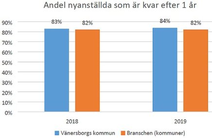 84 procent av de nyanställda, och tillsvidareanställda, är kvar i kommunen efter ett år. Det är något högre än genomsnittet i andra kommuner. Att det är en så stor andel måste tolkas som att de trivs med kommunen som arbetsgivare. Och det är positivt.