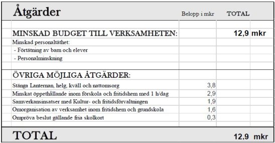 “Om följande åtgärder, beskrivna i bilaga 2, då lämnat budgetförslag ska rymmas inom tilldelad budgetram; Minskad budget till verksamheten 6,2 mkr, Stängning av Lanternan, helg, kväll och nattomsorg 3,8 mkr och Minskat öppethållande inom förskola och fritidshem med 1h/dag 2,9 mkr.”