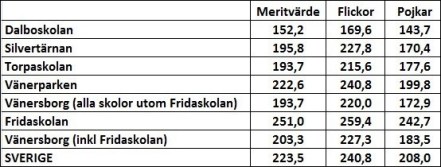 Medelmeritvärdet, dvs den genomsnittliga betygspoängen, minskade drastiskt både 2016 och 2017. Resultatet var uppseendeväckande lågt. I Sverige låg medelmeritvärdet på över 220 poäng. Och inte nog med det, endast 55% av samtliga elever som gick ur åk 9 i Vänersborg 2017 fick betyg i alla ämnen.