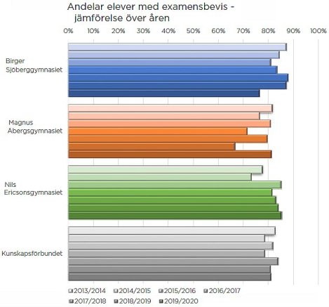 Som synes av diagrammet har examensandelarna i KFV gått upp något lite år 2020 (se de grå staplarna längst ner), medan Birger Sjöberg gjorde en dipp (blå staplar). (Notera dock att i detta diagram tittar man bara på “examen” oberoende av hur många utbildningsår som behövdes för att ta den.) Magnus Åberggymnasiet “dippade” både 2017 och 2019, men ökade både 2018 och 2020. Nils Ericson har de senaste åren gjort jämnare resultat men man ser att skolan “dippade” 2015.