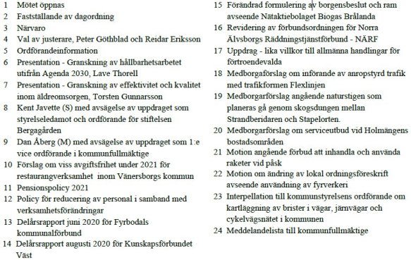 Kommunfullmäktige ska godkänna delårsrapporterna från Fyrbodals kommunalförbund och Kunskapsförbundet Väst. Som jag ser det så finns det inget att erinra mot dessa rapporter. Det finns det inte heller i ärendena om “förändrad formulering av borgensbeslut och ram avseende Nätaktiebolaget Biogas Brålanda” eller “revidering av förbundsordningen för Norra Älvsborgs Räddningstjänstförbund – NÄRF”. Jag tror inte heller att något annat parti eller någon annan politiker har något att säga kring dessa ärenden. De kommer nog bara att helt rutinmässigt klubbas igenom.
