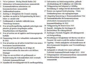 Det är som vanligt väldigt många ärenden som ska behandlas av kommunstyrelsen. En del av dom går vidare till kommunfullmäktige för att avgöras där, medan andra ärenden beslutas direkt på onsdagens sammanträde.