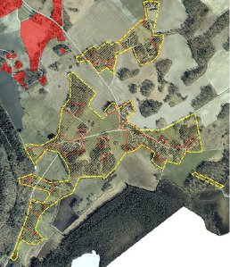 “Kartan visar exempel på en vidare avgränsning (i gult) än den tidigare föreslagna (i rött). Dock behöver beslutet om verksamhetsområde i så fall tolkas så att anslutning först sker i samband med eventuell utbyggnad för fastigheter som idag saknar bostadshus. Not: Heltäckta röda områden på kartan är tidigare beslutat verksamhetsområde.”