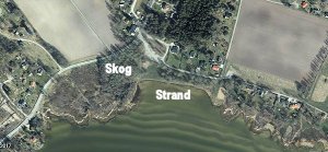 Den omdiskuterade skogsdungen syns tydligt, och den är som synes inte särskilt stor. Badstranden är kort. Tyvärr visar inte flygfotot hur misskött skogsdungen är eller hur stranden till allt större del blir allt gyttjigare och ogästvänligare (se foto nedan).