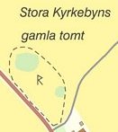 Det är en aktuell karta, det syns tydligt. Det finns nämligen inte något grönt område, som markerar ett fornminne, längs landsvägen i fornminnesområdets södra del. Det är ju nämligen detta fornminne som Bo Carlsson (C) utplånade. Men det är noterbart att hela området fortfarande betecknas som fornlämningsområde – “Stora Kyrkebyns gamla tomt”. I området är både det “Stora impedimentet” och det “Lilla impedimentet” grönmarkerade.