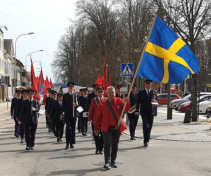 Innan Vänsterpartiets sammankomst var till ända började Socialdemokraterna sin årliga och traditionella 1 maj-demonstration. Som dock har fått ställas in, som så mycket annat, under pandemin. Antalet deltagare i Socialdemokraternas demonstrationer minskade, innan pandemin, successivt under 10-talet, men i år kan den trenden ha brutits. Jag räknade till ca 70 personer, exklusive musikkåren, när jag mötte demonstrationen på Drottninggatan. Det var 10 personer fler än år 2019. I täten med den svenska fanan gick kultur- och fritidsnämndens ordförande Hans-Peter Norén.