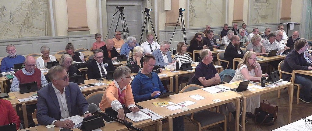 Efter att de flesta ledamöter hade intagit en kolhydratrik lunch samlades de sedan i Folkets hus anrika festsal kl 13.00. Det var några år sedan sist. Fullmäktige har genom åren genomfört många sammanträden i lokalen sedan den gamla sessionssalen stängdes och sedemera revs 2018 på grund av mögelangrepp. Eller vad det nu var.