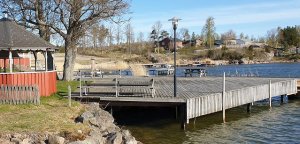 “den nu planerade upprustningen av hamnen mot att skapa ett bättre och utökat skydd mot vind och vågor innanför den nuvarande stenbryggan antingen genom att förlänga densamma väsentligt eller genom att förlägga vågdämpande pontoner utanför bryggan och på detta sätt också skapa förutsättningar för ett antal båtplatser för uthyrning.”![]()