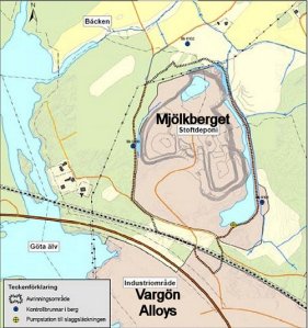 “Lakvatten från stoftdeponin vid Mjölkberget samlas upp i ett lakvattensystem. Lakvatten pumpas till en reningsanläggning där det vid behov (då halten sexvärt krom är förhöjd) behandlas med järnsulfat och filtreras innan det släpps till Göta Älv.”