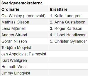 SD utmärker sig med att ha ett namn, som inte är något namn, högt upp på listan. Det är brålandabon Lars Nordquist som fick 173 personröster, trots att han blev utesluten ur partiet några dagar före valet, och blev borttagen från valsedeln. Det var vad jag har hört inte för att han hade uttalat något typ rasistiskt. Det är ju annars den vanligaste orsaken till uteslutning i SD. Det sägs att det istället handlade om hur han “pimpade” sin SD-bil. Vissa SD:are röstade sannolikt på honom för att markera sitt missnöje med partiets beslut om uteslutning. Det kanske hade varit en effektivare protest att rösta på något annat parti…