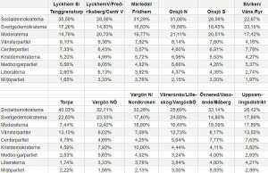 Slutligen ska jag också presentera resultaten från kommunens olika valdistrikt. Som tidigare visar minus-tecknen att väljarna i distriktet har lagt färre kommunröster till respektive parti än hur de röstade till riksdagen. En positiv siffra, utan minus-tecken alltså, innebär således att partiet har fått fler röster till kommunfullmäktige än till riksdagen. (Siffrorna grundar sig på det officiella resultatet, men det är jag som har räknat. En liten varning alltså.)