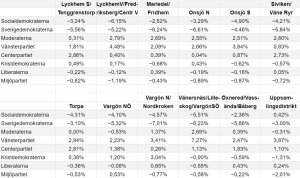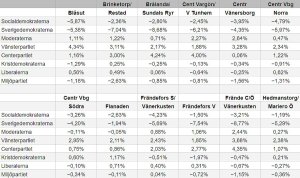 Slutligen ska jag också presentera resultaten från kommunens olika valdistrikt. Som tidigare visar minus-tecknen att väljarna i distriktet har lagt färre kommunröster till respektive parti än hur de röstade till riksdagen. En positiv siffra, utan minus-tecken alltså, innebär således att partiet har fått fler röster till kommunfullmäktige än till riksdagen. (Siffrorna grundar sig på det officiella resultatet, men det är jag som har räknat. En liten varning alltså.)