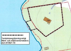 Den här domen är också intressant av samma orsak. Mark- och miljöverdomstolen anser nämligen även i detta fall att tomtplatsen ska sträcka sig ända ner till vattnet. Domen innebar att gräsytan vid vattnet, se pil på fotot, också skulle ingå i tomtplatsen. Även här försvann allmänhetens fria passage längs stranden.
