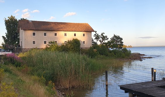 Magasinet ligger på en liten udde strax bredvid småbåtshamnen i Sikhall.