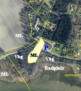 “Vbg” är kommunens mark och “ML” är Magnus Larssons mark. Det ska noteras att Larsson har förvärvat det mindre gula området. Det innebär att han nu äger en del av infarten till parkeringen och en del av själva parkeringen.