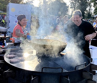 Nytt för i år var att Miranda Davidsson ordnade med hamburgare, grillspett, vårrullar och annat smaskens. Det grillades på en grillvagn designad av Magnus Larsson själv. Det var en imponerande skapelse – hjul och axlar från en hästkärra och metallringen var ett gammalt traktorhjul. En dalsländsk variant av en foodtruck från 1800-talet skulle man kunna säga.