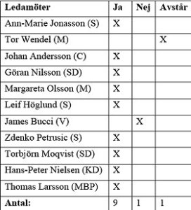 Ärendet avgjordes med en omröstning. Tor Wendel (M) hade i ett tidigt skede meddelat att han inte deltog i beslutet. James Bucci från Vänsterpartiet röstade för den södra vägsträckningen. Resten av nämndens 9 ledamöter röstade på att Brättelänken ska gå mellan Brätte stad och Vassbotten – mitt genom fornminnesområdet…