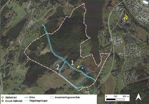 Vattenfalls ledning grävdes ca 15 meter norr om Brättegårdsvägen, dvs den smala grusvägen förbi Brätte mellan de synliga fornlämningarna och Vassbotten. Det borrades även i den nordvästra delen av området och i en tredje etapp grävdes ett schakt längs med “Kvarnbäcken” från sydväst upp mot Brättegårdsvägen. De feta svarta linjerna på kartan nedan visar ledningen. De markerade punkterna, t ex S1, visar de arkeologiska undersökningspunkterna.