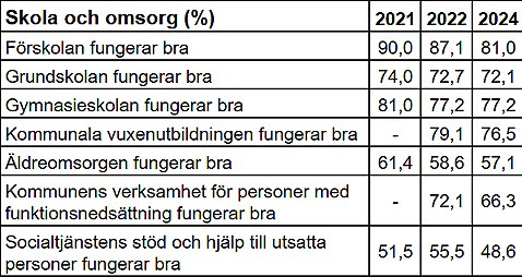 Nästa frågeområde handlade om skola och omsorg. Invånarna i Vänersborgs kommun svarade så här: