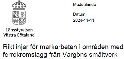 Den 11 november 2024 skickades ett meddelande från Länsstyrelsen till Vänersborgs och Trollhättans kommuner. (Handlingen diariefördes av någon anledning dock inte i Vänersborg förrän den 13 mars – 4 månader senare…) Det var ett dokument med rubriken “Riktlinjer för markarbeten i områden med ferrokromslagg från Vargöns smältverk”: