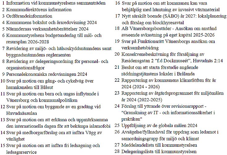 De här presentationerna tar en stor del av förmiddagen i anspråk. De följs av ytterligare information och föredragningar. De handlar om “Kommunstyrelsens budgetunderlag till MRP 2025-2027”, “Personalekonomiska redovisningen 2024” (Peken) och “Vänersborgs kommuns bokslut och årsredovisning 2024”. Efter det informerar kommundirektör Lena Tegenfeldt och kommunalråden om sina förehavanden sedan sist. Kommunalråden i Vänersborgs kommun är som alla vet ordförande Benny Augustsson (S), 1:e vice ordförande Mats Andersson (C) och 2:e vice ordförande Henrik Harlitz (M).