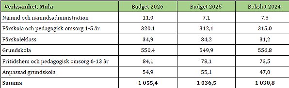 Enligt beslut om Mål- och resursplan 2026–2028 fastställde kommunfullmäktige barn- och utbildningsnämndens budgetram 2026 till 1.027,1 milj kr, alltså drygt 1 miljard. Efter detta beslut har nämndens ram justerats upp med 28,3 milj kr för lönerevision vilket ger en total budgetram för 2026 om 1.055,4 milj kr.