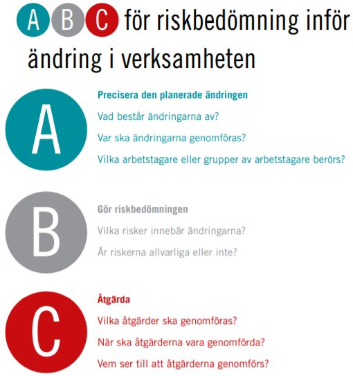 Riskbedömningen ska enligt Arbetsmiljöverket göras i tre steg (se broschyren “Riskbedömning inför ändringar i verksamheten”):