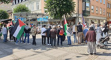 Efter att ha korsat Kungsgatan in på gågatan hördes ropen skalla. Det var en demonstration mot Israels krig i Gaza och för ett slut på bombningarna. Det var ingen som var i stan som kunde missa de palestinska flaggorna. Inte heller de personer som satt på någon av stans många caféer kunde undvika slagorden som ekade mellan husen.