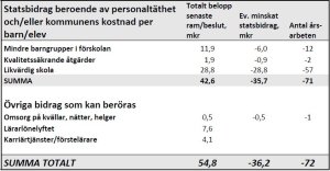 Den stora besparingsåtgärden är “minskad budget till verksamheten”. Det betyder bland annat större barngrupper i förskola och större klasser i skolan. Vilket leder till personalminskning…