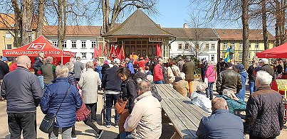 Det var fler personer på socialdemokraternas 1 maj-firande än på Vänsterpartiets, kanske 150-200. Publiken fick höra stadsmusikkåren spela medan människorna fikade och åt korv med bröd. Efter en stund äntrade Benny Augustsson podiet och höll sitt tal.